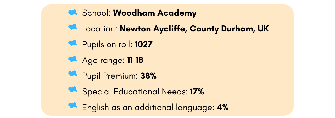 Woodham Academy has introduced Sounds-Write as a targeted intervention for non-readers and low-attaining readers in Years 7–9. Students are identified through KS2 and reading age data, and those with the most severe needs are allocated to Sounds-Write. These students receive sustained intervention until they have made sufficient progress. Other literacy interventions are in place for students who can decode but need help to improve fluency or comprehension.