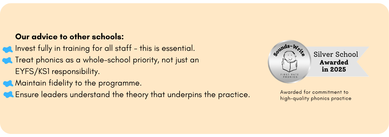 We implemented Sounds-Write strategically and incrementally, beginning in EYFS before embedding it consistently into KS1. From the outset, we ensured that: